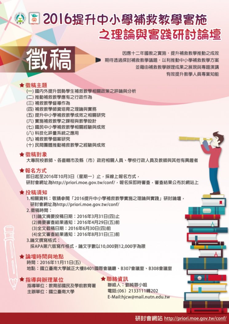 三、徵稿注意事項、寄送方式與相關資訊請參閱實施計畫(如附件一),或至本研討會網站,網址為:http://priori.moe.gov.tw/conf/。
