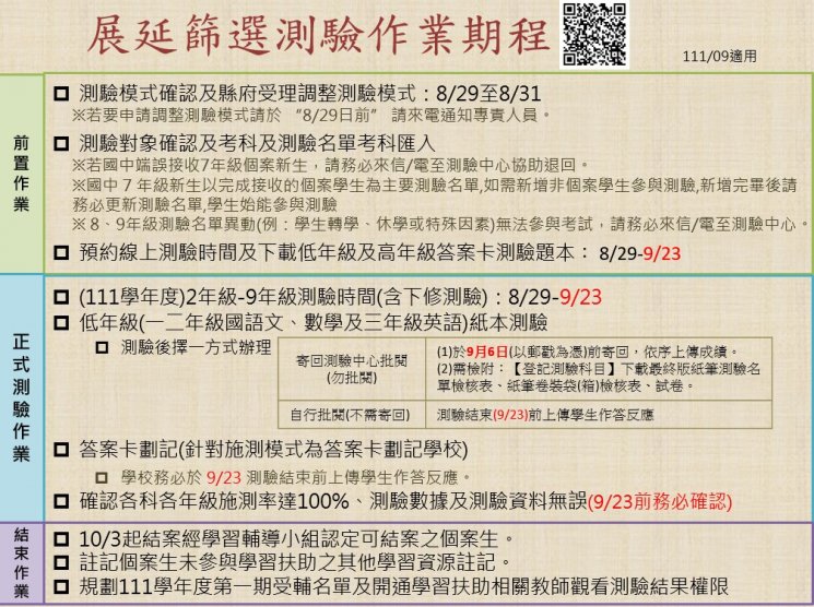 有關202205展延篩選測驗作業已在8/26辦理科技化評量系統與網路填報系統操作已告知說明相關細節,另外再次提醒請配合202205篩選測驗